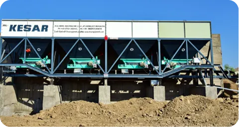 Each bin having independent belt conveying system is driven by AC variable speed motors for accurate & best weighing (to minimize overflow from hot bin) of aggregates and is supplied to Gathering Conveyor as per job mix. At the discharge end of gathering conveyor a single deck vibrating screen is provided for oversize removal of aggregates. This arrangement saves fuel & also eliminates overhead chute for disposal of oversize metal. One bin has vibratory motor. The bin shall be supported on sturdy steel structure and loading mouth of 2.76m x 2.20m. The bin shall be loaded by tipper width of 2.44m.