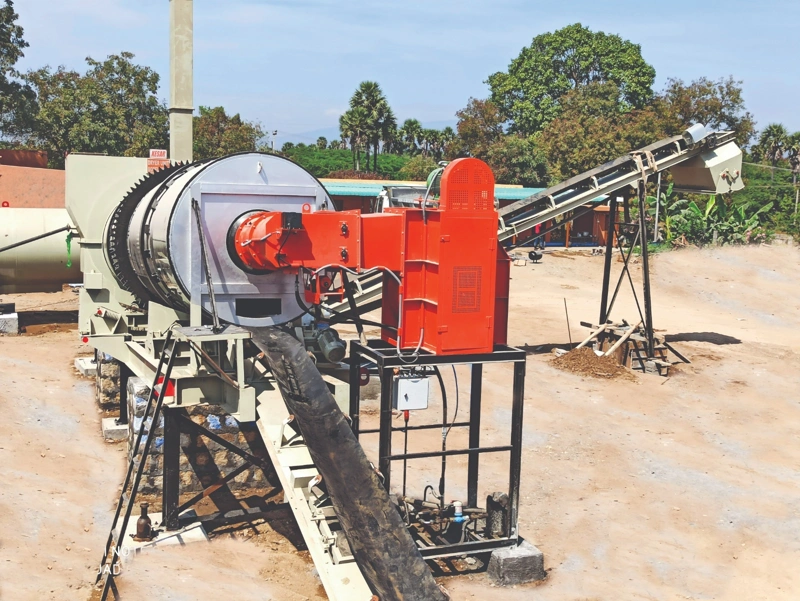 Skewable trunnion rollers also can be adjusted for minimum thrust force on thrust wheels and run drum smooth with minimum wear. 2-dam plates inside drum allow longer heating and mixing time to aggregates thus, help to produce super quality of mix. Sweep rotor discharges hot mix material on to load out conveyor where a thermocouple is mounted on discharge chute to measure mix material temperature. A multicone cyclone box & exhaust fan with motor and chimney are mounted on the same chassis.