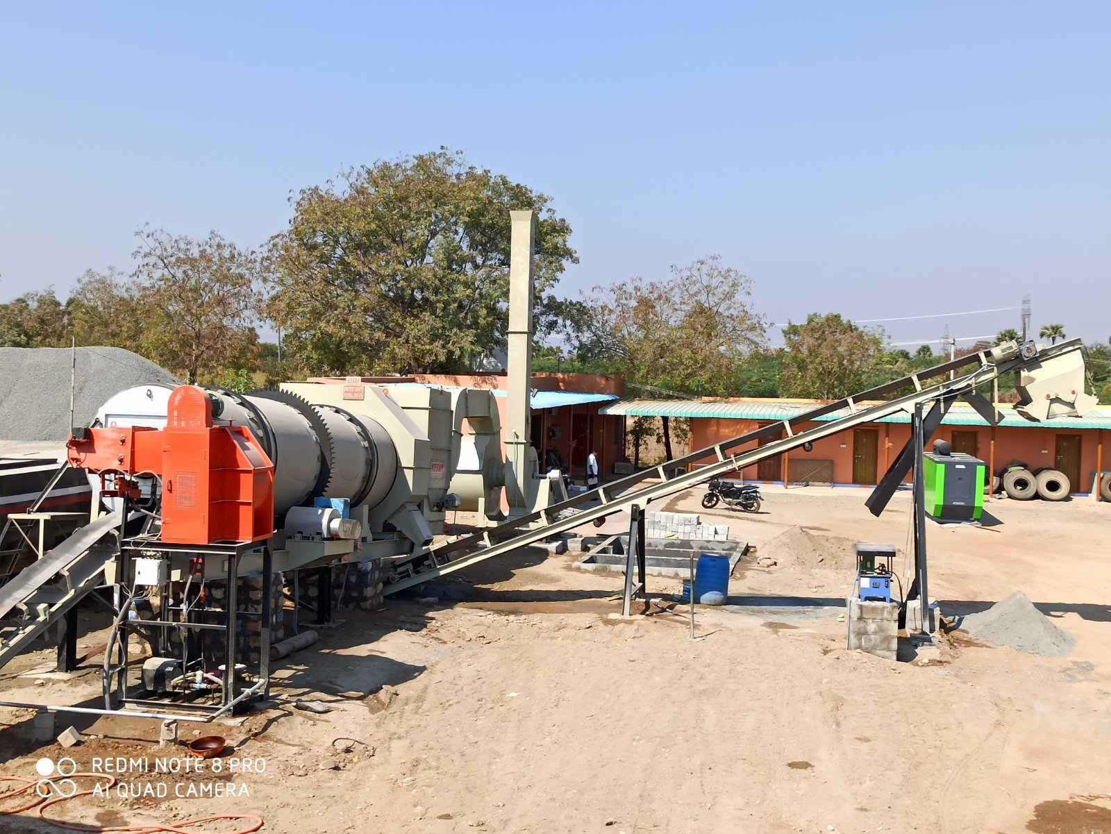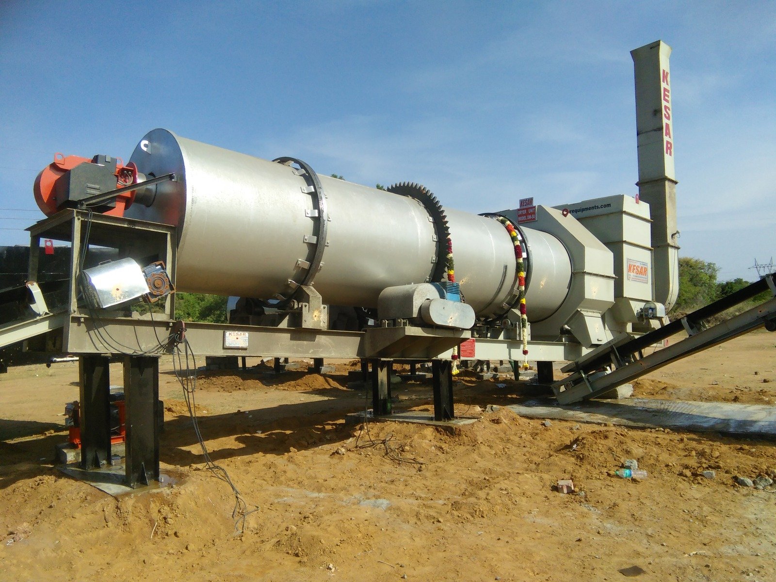 Cylindrical dryer drum supported on 4-trunnion rollers by 2 steel tyres is driven by a chain & worm gear box & an AC motor. It receives weighed cold aggregates from slinger conveyor at one end & discharges hot asphalt mix from other end on to a load out conveyor.