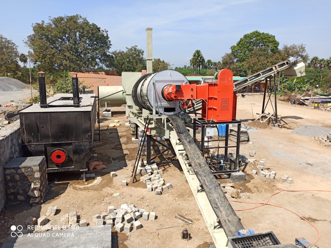 A high pressure jet burner fitted at feeding end fires red hot flame in to the drum to heat & dry wet aggregates. specially designed cascading and notched flights in heating zone allows maximum heat transfer from flame & hot gases to aggregates. J-shaped flights in mixing zone thoroughly mix & perfectly coat bitumen on aggregates & filler.